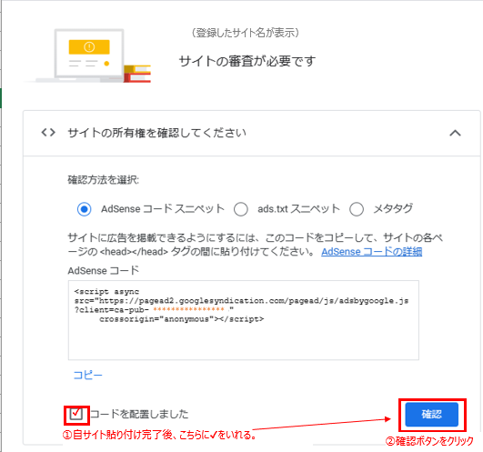 自サイトへの貼り付けおよび保存が完了したら、Google AdSenseのサイトに戻り、「コードを配置しました」に✔を入れ、確認ボタンをクリックします。