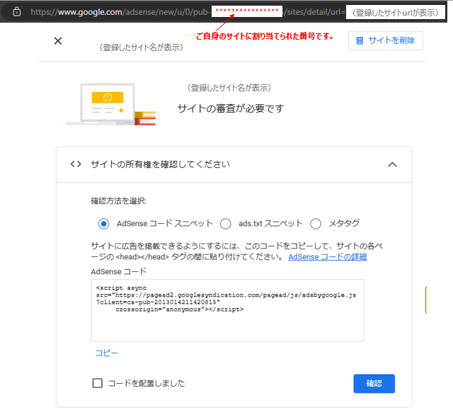 AdSenseの審査申込を進めると、サイトの所有権を確認するために、Googleが用意したAdSense コードを自分のサイトに登録する手順が必要となります。