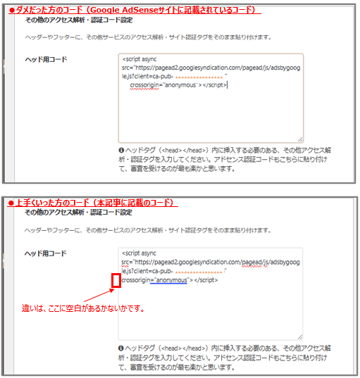 Google AdSenseサイトで指定されたコードをそのまま貼り付けたのですが、