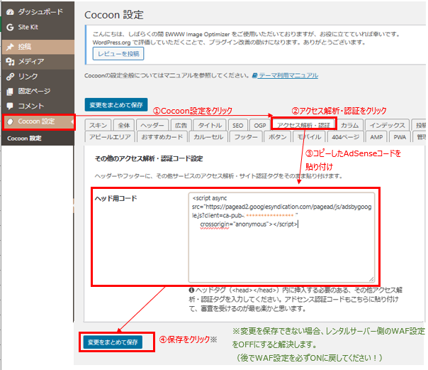 具体的には、AdSenseコードスニペットを、自サイトの<head></head>タグに貼り付ける必要があります。