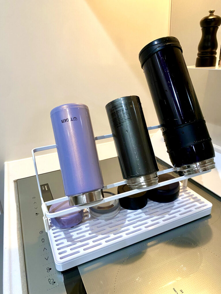 『さっと立てかけるだけ!マグからジャグボトルまで干せるボトルスタンド』