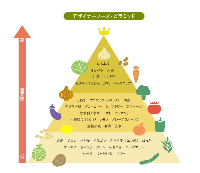 アメリカの国立がん研究所が1990年に発表した『デザイナーフーズピラミッド』により、にんにくはがん予防の最上位に位置づけられています。(まじか!!)