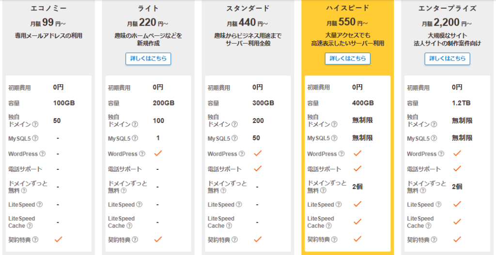専用メールアドレスの利用から、趣味やビジネス用途でのサーバー利用、また、大量アクセスでも高速表示したいサーバー利用等、用途別に5種類ものプランがあります。